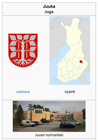(Wikipedia, 2012): Juuka (ruots. Juga) on Suomen kunta, joka sijaitsee Pohjois-Karjalan maakunnassa. Kunnassa asuu 5 436 ihmistä, josta noin 3 200 sen kirkonkylässä ja lähialueilla. Juuan pinta-ala on 1 846,57 km2, josta 344,78 km2 on vesistöjä.