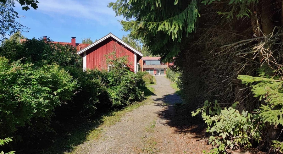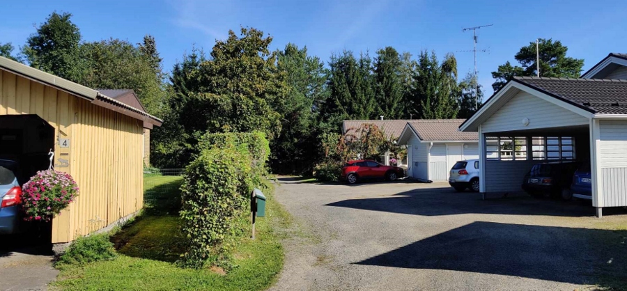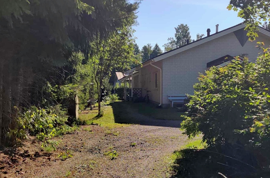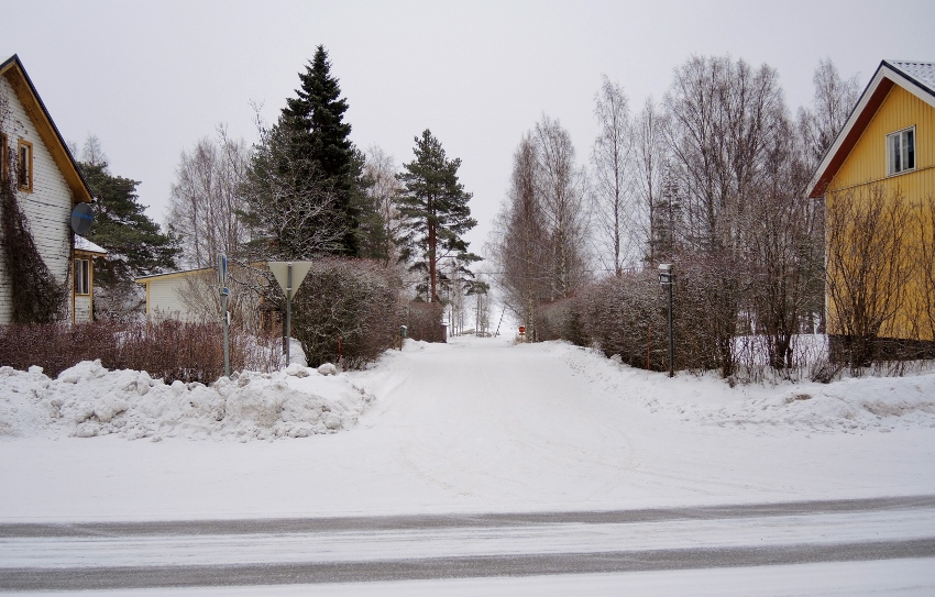 Umpikujan pohjoispään viimeisen rivitalon vasemmalta puolelta kulki entinen katutielinja kohti Puulan rantaa - kuvattu 15.8.2024 (S&J). Umpikujalle käännös oikealle.