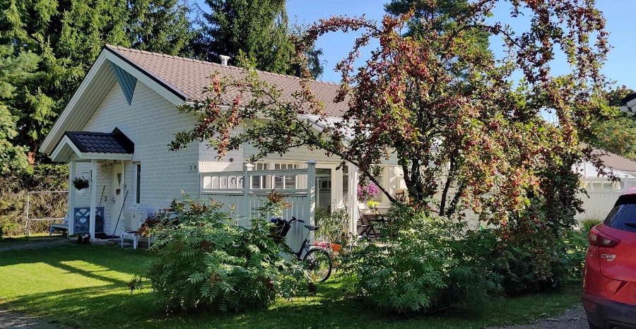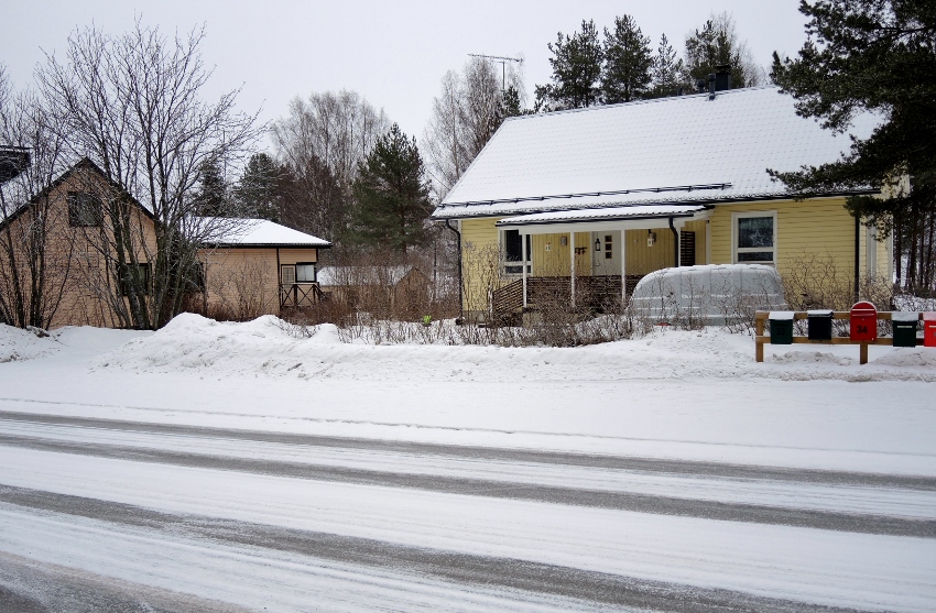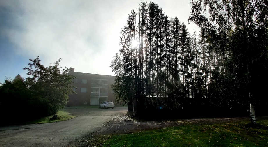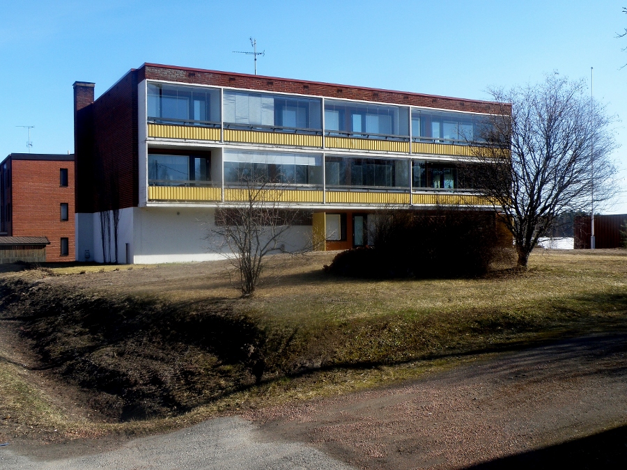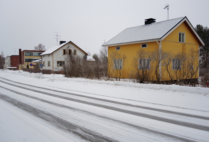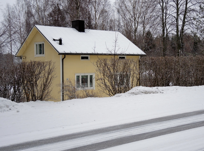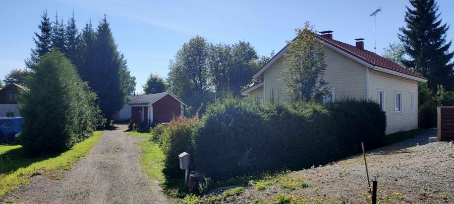 Sama alunperin Myllykoski Oy:n työsuhdeasuintalo kuvattuna kahdesti 15.8.2024 (S&J) pihan eteläisellä vierustalla kulkevalta entiseltä katutielinjalta.