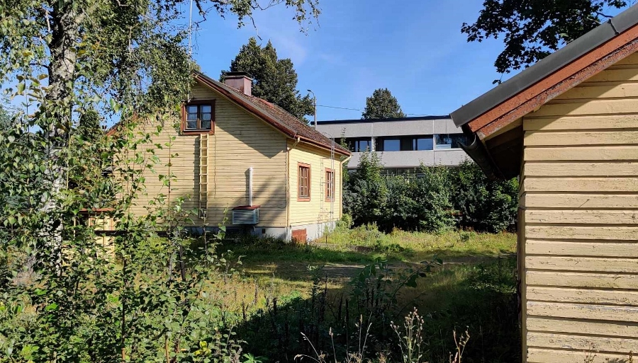 - kuvattu 26.7.2011 (S&J). Edessä olevalle niittytontille oli kuvaushetkellä suunnitelmissa rakentaa pieni rivitalo tai paritalo.
