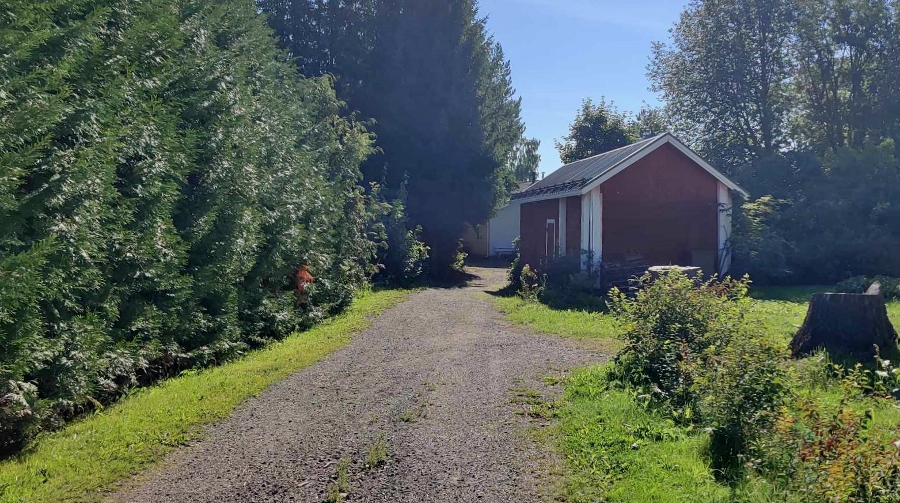 Samalta vanhalta katutielinjalta - edessä näkyy kuusiaidan lähellä Umpikujan viimeinen rivitalo (valkoinen), jonka pohjoispuolelta (kuvassa vasemmalta) tielinja jatkui Puulan rantaan - 15.8.2024 (S&J).
