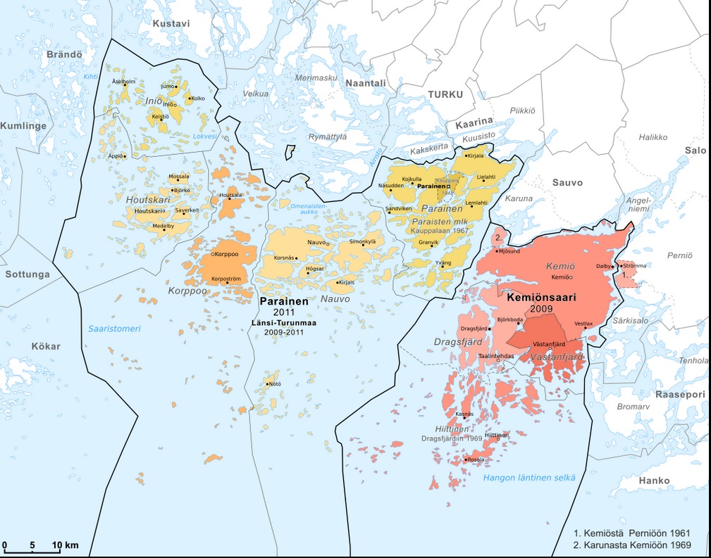 Kartta Turunmaan, Paraisten kaupungin ja Kemiönsaaren kunnan, kuntaliitoksista.