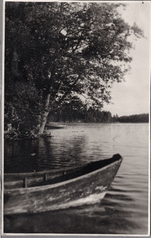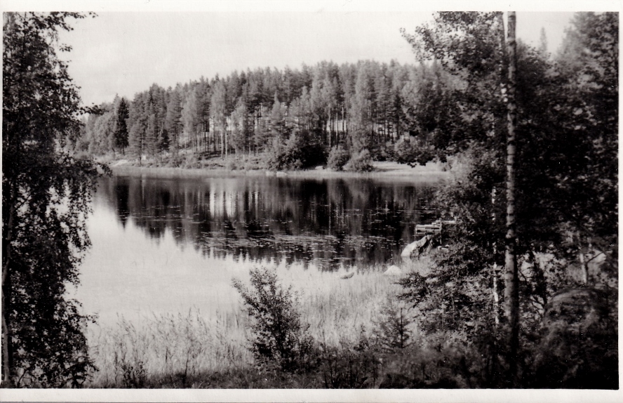 Kaisa Huttusen albumista maisemakuva vuosikymmenten takaa - ilmeisesti kuva on hänen kesämökiltään. Mökin tarkka sijainti Kangasniemellä ei ole selvillä.
