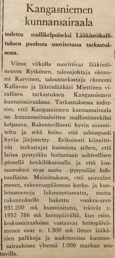 Kunnanlääkäreillä ei aluksi ollut kunnan puolesta edes asuntoa. Ensimmäinen sairaala Kangasniemeen perustettiin v.1920, kun maisteri V.Juuselalta oli ostettu tarkoitukseen sopiva huvilarakennus Salmenkylästä. Sairaalassa oli vain kymmenen sairaansijaa, mutta 1930-luvun loppuun mennessä siellä oli ehditty hoitaa yli 2000 potilasta.