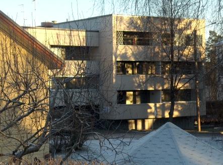 Jatkettaessa Otto Mannisen tien itäpuolta vanhasta puhelinkeskuksesta apteekin suuntaan tullaan Puulavedentien risteyksessä Jenny ja Lauri Hämäläisen asuintalolle. Tämä kuva otettu 12.5.2007 (S&J)(Snellmanin päivänä).