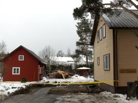 Myllykosken talo ja sen pihapiiri kuvattuna 2.4.2009 (S&J) Puulavedentien puolelta.