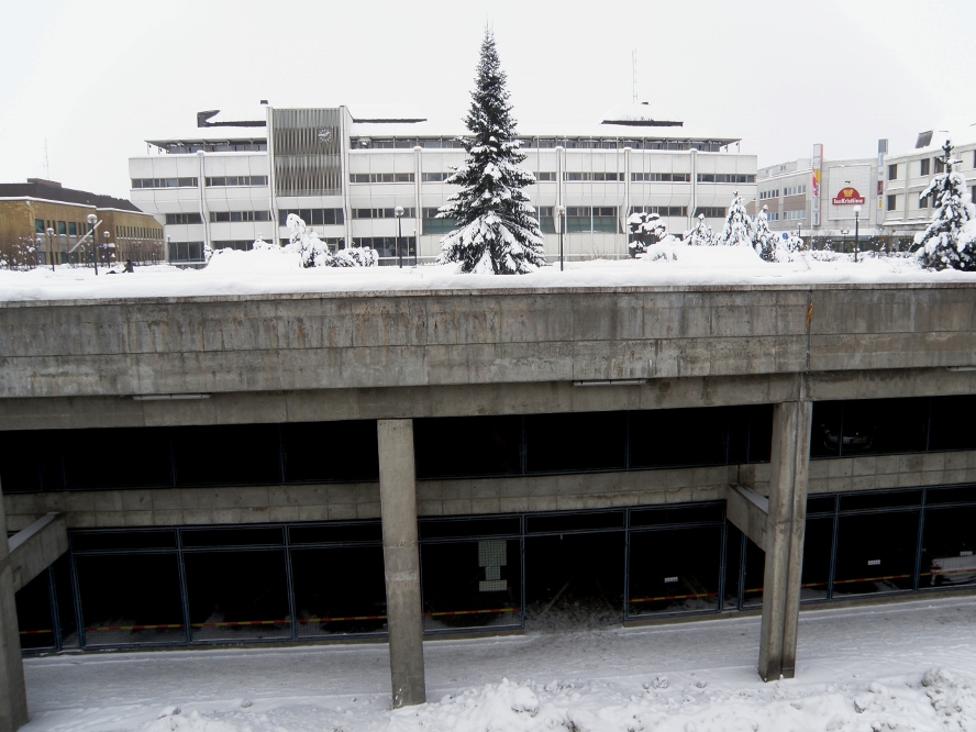 Taustalla kaupungintalo - edustalla tori betonikannella, alla pysäköintihalleja - kuin helvetin esikartanoita. Kuvan oikeassa reunassa hotelli Lappee.
