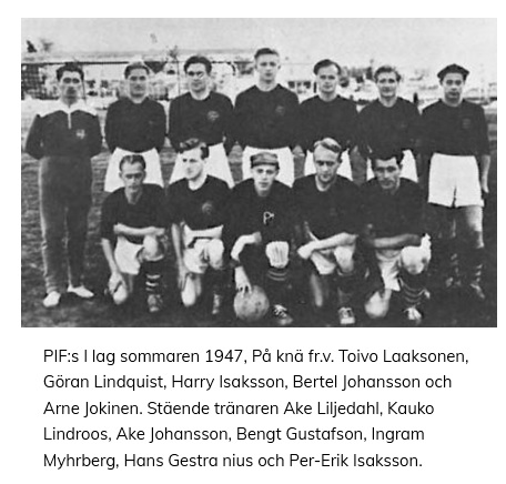 PIF: 1948 Laget rekryterar sina spelare bland följande mannar: Harry Isaksson, Toivo Laaksonen, Aarne Jokinen, John Sjöberg, Göran Lindqvist, Bertel. Johansson, Kauko Lindroos, Ingram Myhrberg. Bengt Gustafson, Åke Johansson, Per-Erik Isaks son, Hans Gestranius, Ake Gustafsson, Torsten Wahlstén, Ove Lindström och Nils Söderström.