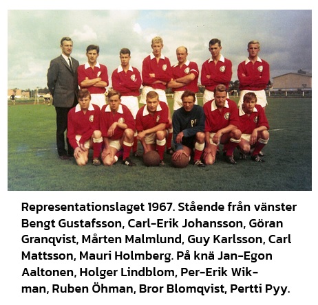 PIF * 1965 : Representationslagets kamp i kretsserien är fruktlös. Man vinner visserligen hälften av som marens matcher, men placeringen i serien blir an språkslös. Tränaren Helge Blåberg och de övrigal sektionsledarna Tor Tefke, Tor Christiansson, Bengt Gustafson, Henry Fagerholm, Erik J. Jo hansson, Henry Vikström, Guy Karlsson, Harry Henriksson och Ilmari Viitanen är rådvilla.
