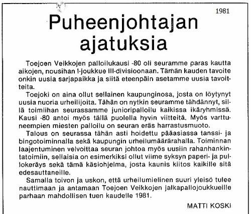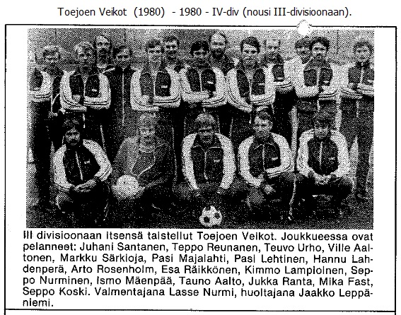 Toejoen Veikot 1984: Valmentajat: Reino Leppänen ja Arto Rosenholm. Peliasu - paita vihreä, housut valkoiset.