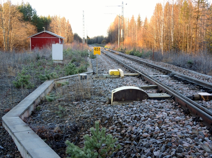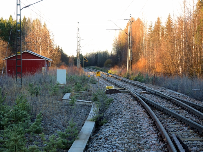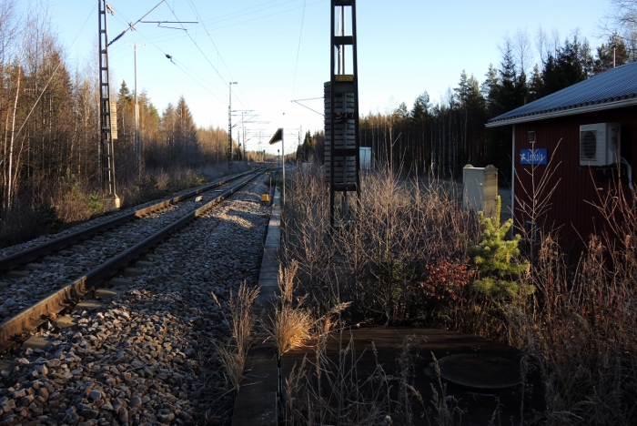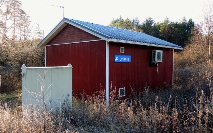 Lelkolan nykyisen kohtaamispaikan eteläpäässä kuvan laitesuojarakennus - 28.10.2015 (S&J). Entinen asema sijaitsi 500 metriä etelämpänä.