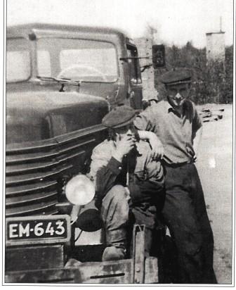 Nämäkin kuvat ovat Arto Tammisen kirjasta. Ylemmässä kuvassa Veikko Maijala ja Armas Valtonen poseeraavat Maijalan Vanajan vierellä. Auto on 1950-luvun mallistoa - vanha kunnon 'piikkinokka' Vanaja.